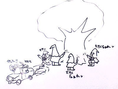 GM「日暮れ時、スーツに白衣の集団が、桜の主を取り囲んで、何かをしているようだ」